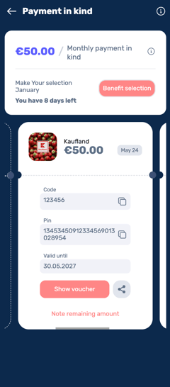 If you would like to use your €50 non-cash benefit budget as a digital shopping voucher, you can choose between different retail partners and also customize the value individually